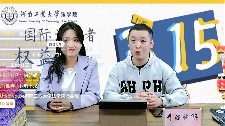 学子化身法律主播, 开启“普法”模式。声情并茂的现场普法、热情幽默的连麦问答、耐心细致的线上解忧,使一个小时的直播气氛热烈,互动频繁。直播观众突破3万人,收获网友互动共计2000余条,现场解答网友法律问题10多个,通过线上直播,与同学们云端互联互通,答疑解惑,实现线上“学法、知法、守法、护法”的目标。