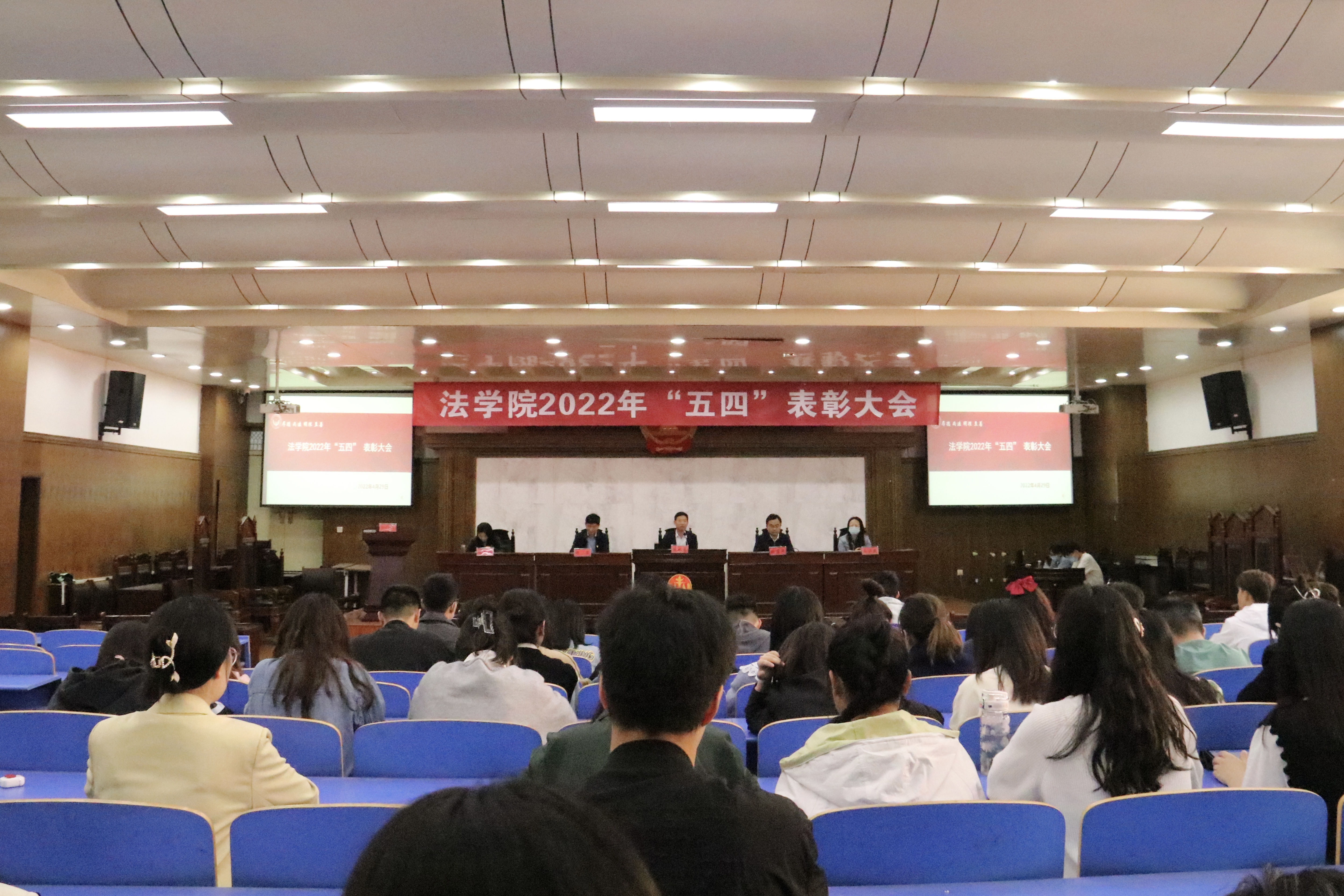 在3121报告厅举行2022年“五四”表彰大会,表彰先进,树立典型,凝聚合力。院党委书记陈从志、院长张道许、副书记许文、院长助理南海燕出席,全体辅导员、受表彰的学生代表及各年级学生代表参加会议。会议由学工办负责人庞文娟主持。