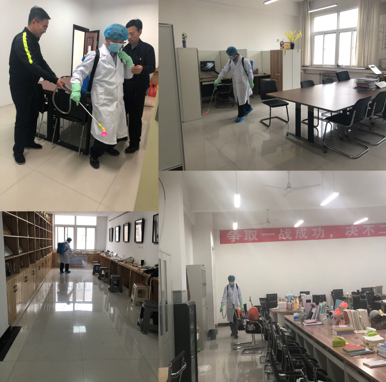 对学院自习室、教研室、办公室、走廊、厕所等公共场所进行了全方位、无死角的消杀通风。许文副书记赤膊上阵,身着防护服、肩扛喷药桶、手执喷药枪,全程完成药物喷洒工作。
