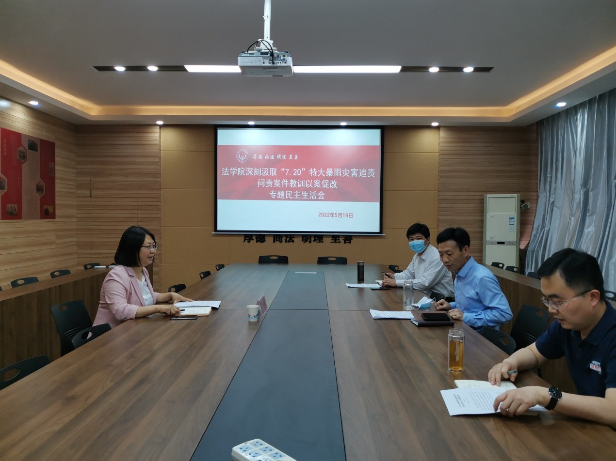 在3424会议室召开郑州“7·20”特大暴雨灾害追责问责案件以案促改专题民主生活会,副校长陈桂香到会指导,学院领导班子成员参加会议,会议由学院党委书记陈从志主持。