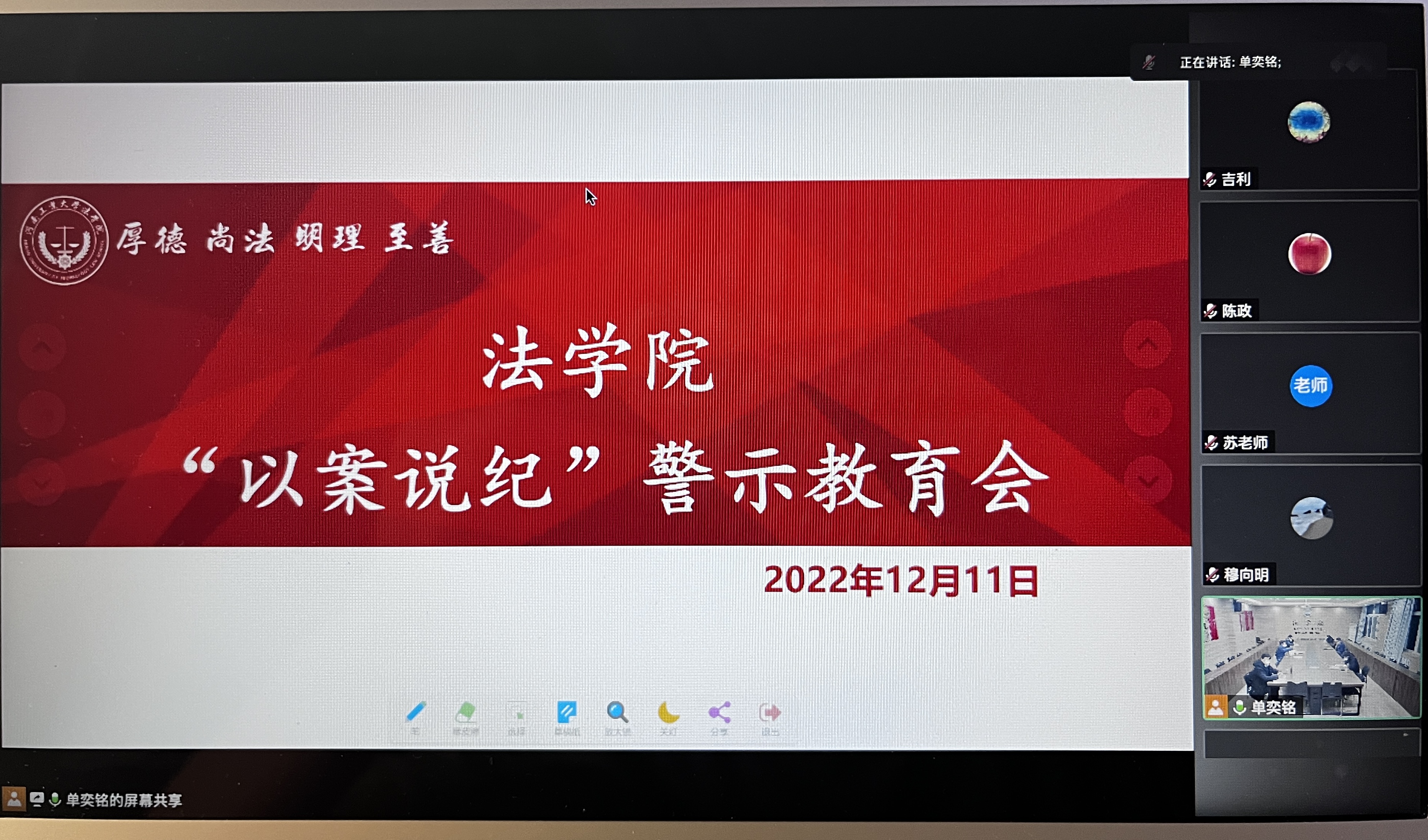 韩永刚提醒广大党员和老师,要明纪法,知敬畏。在思想层面,树立法治思维、严明纪律规矩,夯实清正廉洁的思想基础;在管理层面,查漏洞、严管理、严监督,扎紧拒腐防变的制度笼子;在个人层面,严以修身、严于律己,守住法治红线道德底线!