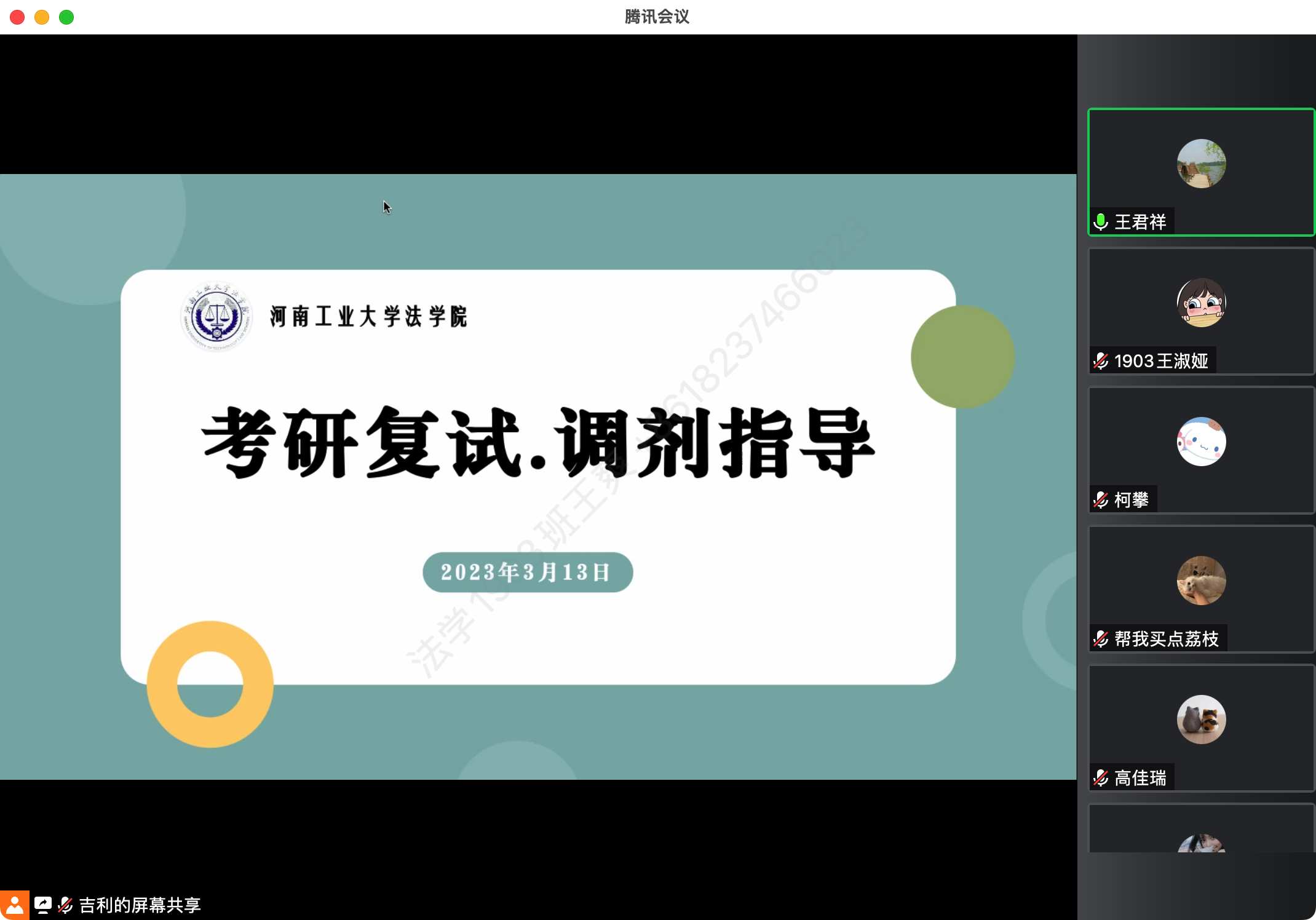 通过腾讯会议线上平台举行考研复试与调剂指导会。学院党委副书记许文、教授王君祥、学院辅导员、2018级优秀校友代表及70余名考研学子参加会议。会议由街射