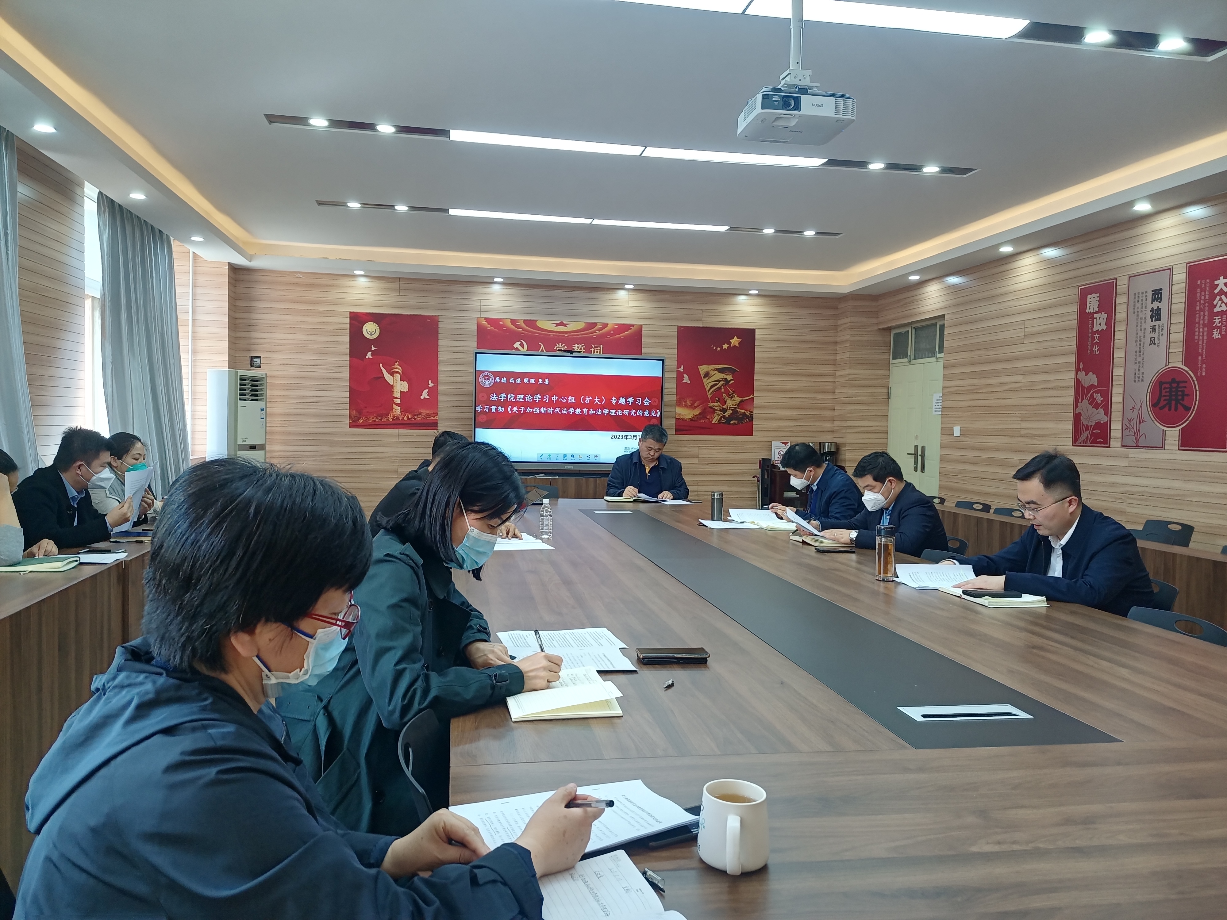 党委理论学习中心组(扩大)在3424会议室专题学习中共中央办公厅、国务院办公厅印发的《关于加强新时代法学教育和法学理论研究的意见》,并就贯彻落实《意见》精神展开研讨。学院领导班子成员、教研室主任和全体高级职称人员参加学习研讨。会议由学院党委书记韩永刚主持。
