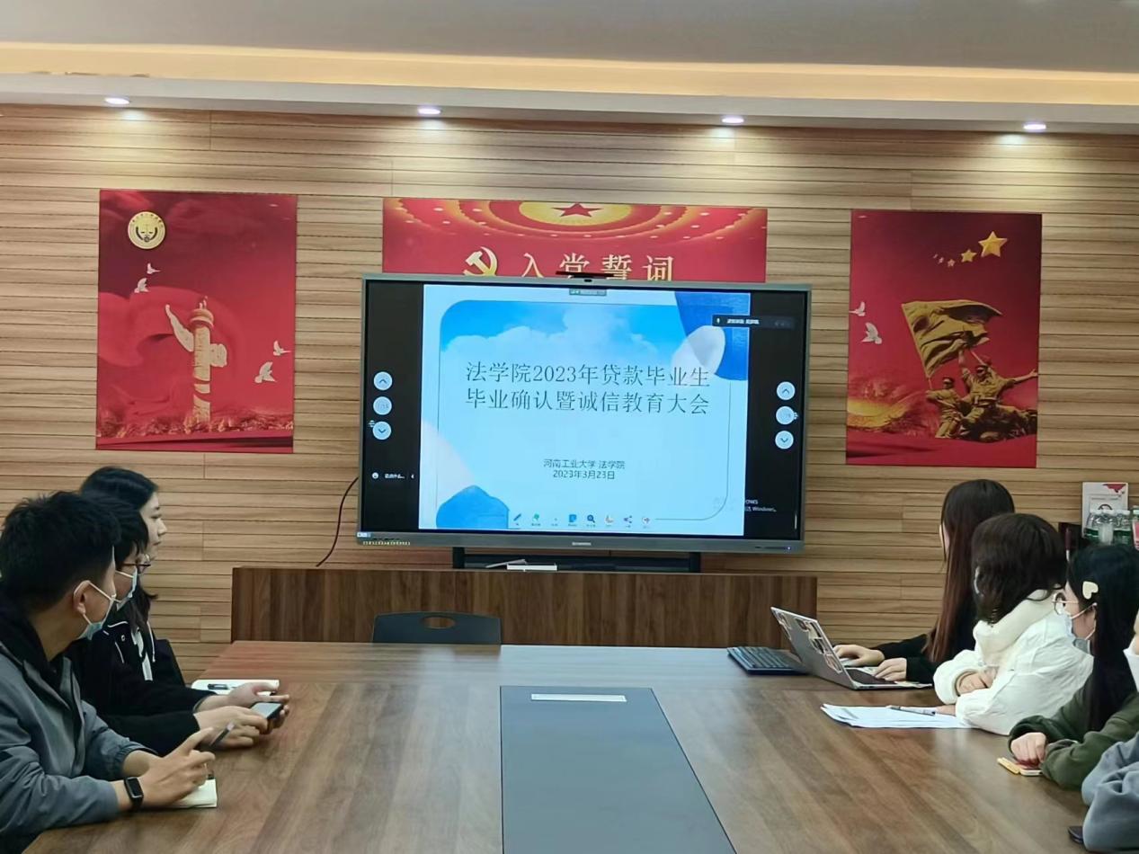 于3月23日在3424会议室,以线上、线下相结合的方式,举行贷款毕业生毕业确认暨诚信教育会议。学院负责资助工作的辅导员周静、资助工作专员及2023届贷款毕业生参加会议。