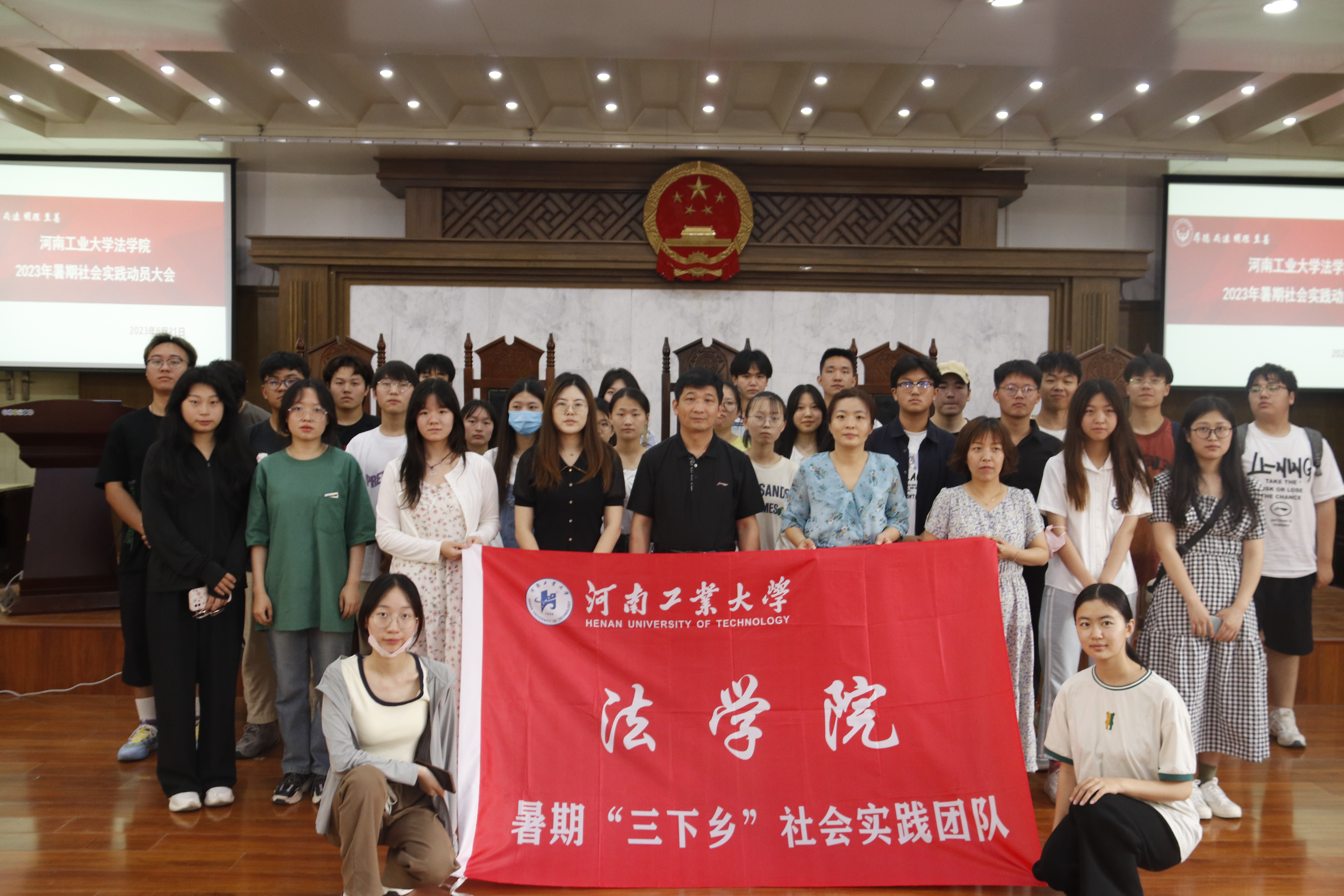 于6月21日在模拟法庭召开2023年暑期“三下乡”社会实践部署动员大会。学院党委副书记许文、学工办主任庞文娟、团委副书记吉利、辅导员周静及2021级、2022级学生代表参加会议。