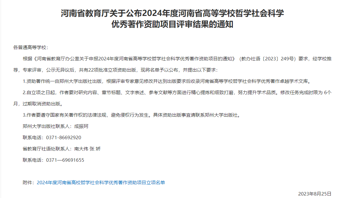 近日,河南省教育厅公布了2024年度河南省高校哲学社会科学优秀著作资助项目立项结果,共有22项批准立项资助出版。街射