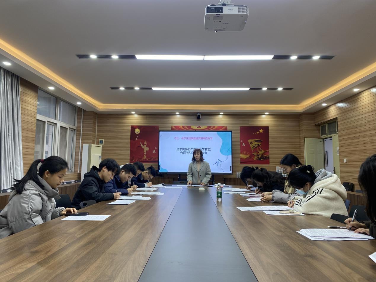 在3424会议室召开2023年国家助学贷款合同签订及诚信教育会议。辅导员周静、资助工作人员及52名高校助学贷款学生参加会议。