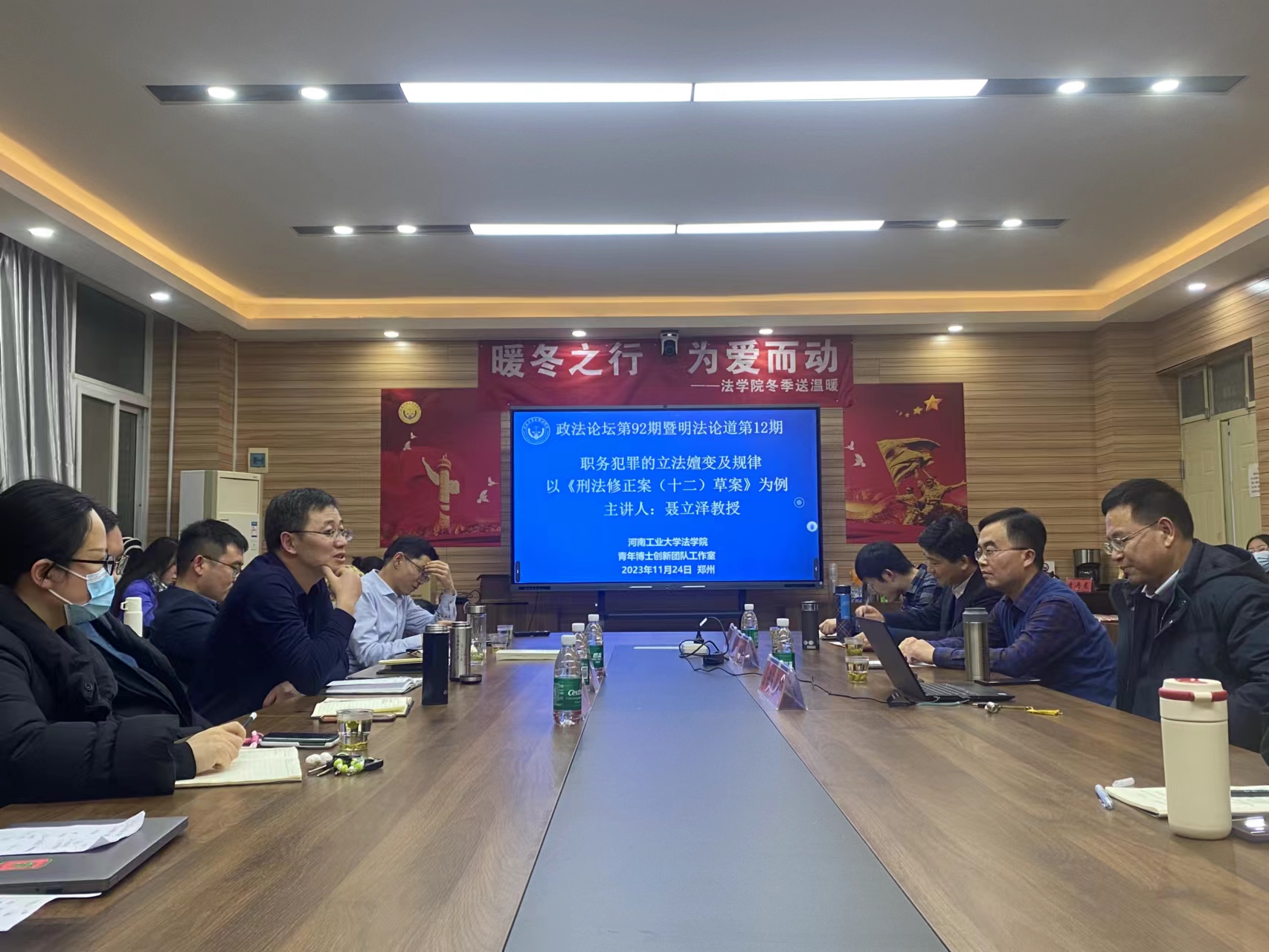 在学院3424会议室成功举办“政法论坛第92期暨明法论道第12期”学术活动。此次活动邀请中山大学教授、博士生导师、广东省网络犯罪研究基地主任聂立泽作题为“职务犯罪的立法嬗变及规律—以《刑法修正案十二(草案)为例》”的学术报告,王君祥教授、单奕铭博士、王文明博士、陈辉博士作为与谈嘉宾。街射
