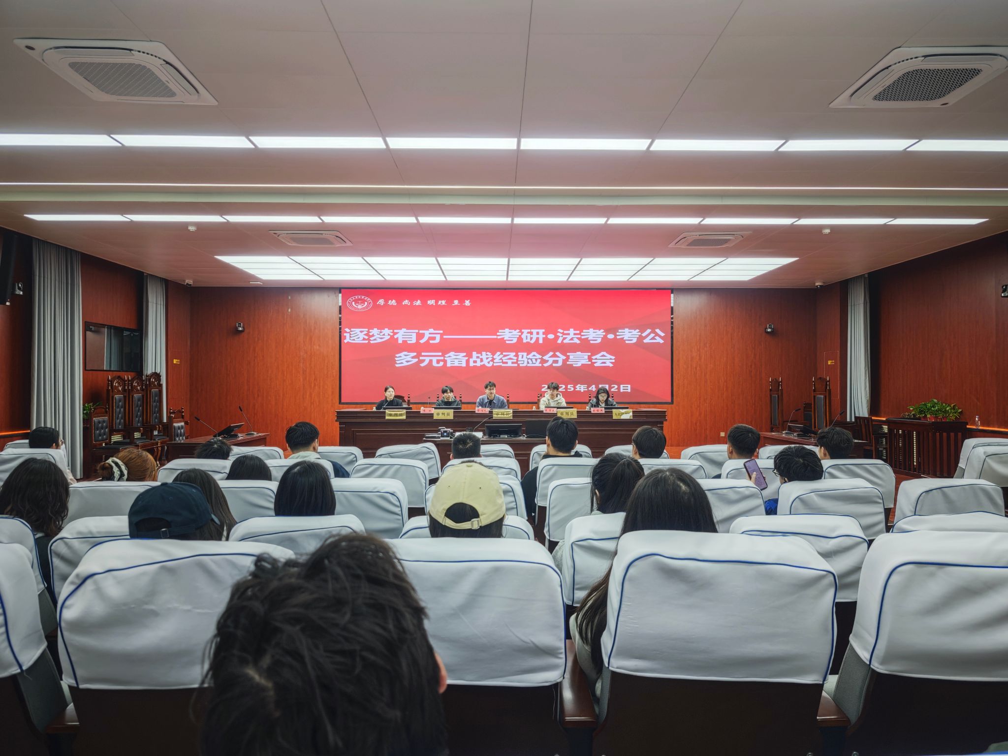 在3121模拟法庭成功举办“逐梦有方——考研·法考·考公多元备战经验分享会”。分享会特邀四位在研究生、法律职业资格及公务员考试中双线上岸的优秀学长学姐担任主讲嘉宾,吸引百余名学子积极参会,现场气氛热烈,互动频繁。分享会由街射