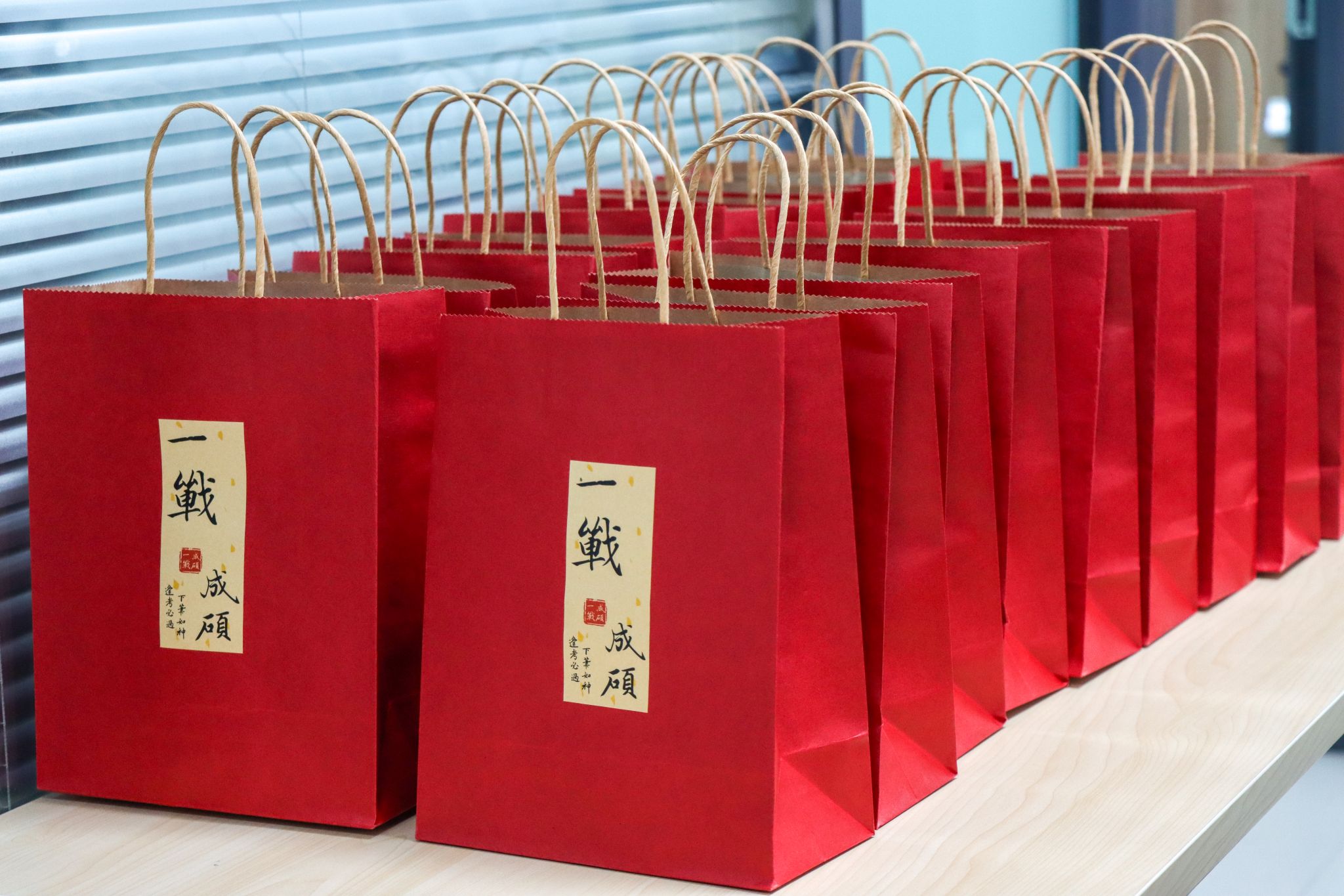 党委书记许文鼓励同学们,要善用系统思维将书本读“薄”,及时查漏补缺巩固要点,同时要以饱满的热情和坚定的决心迎接挑战,书写属于自己的辉煌篇章。院长张道许提醒同学们,在努力学习的前提下,注意身体,确保有良好的身体素质面对高强度的学习压力,希望大家能在应考前调整好心态,合理规划剩余复习时间。随后,学院领导为同学们发放了含有一战“橙”硕-脐橙、好运“旺旺”-旺仔牛奶、平稳上岸-苹果、百事大吉-百事可乐等物品的“暖心加油包”。