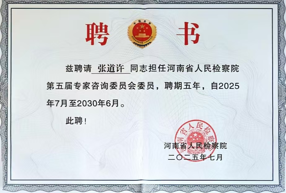 院长张道许教授受聘河南省人民检察院第五届专家咨询委员会委员,这将加强学院与检察机关的深度合作,深化检学研共建机制,进一步提升学院的影响力。(街射