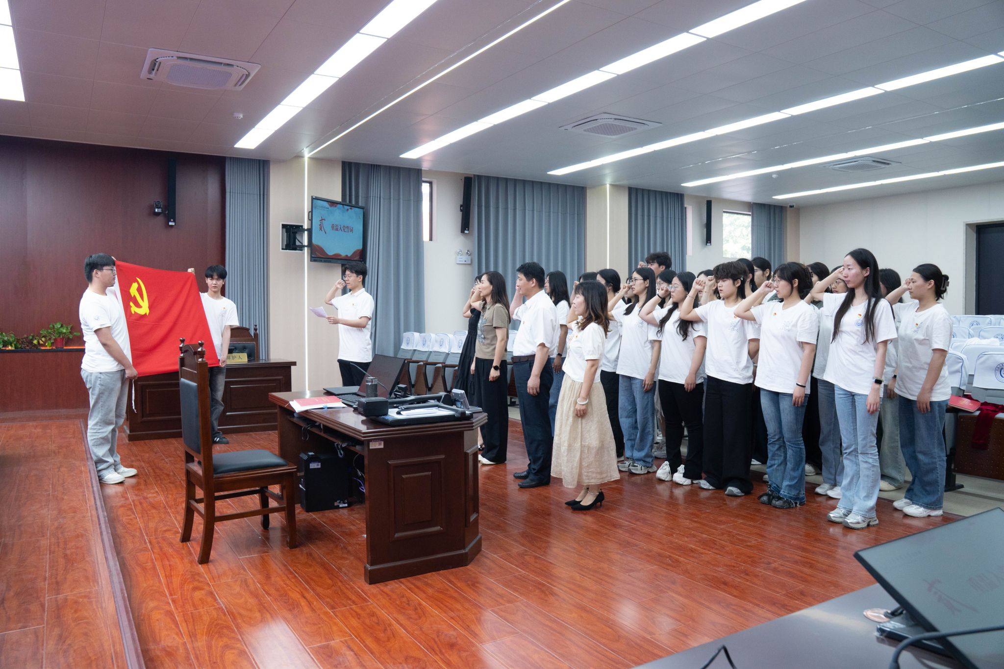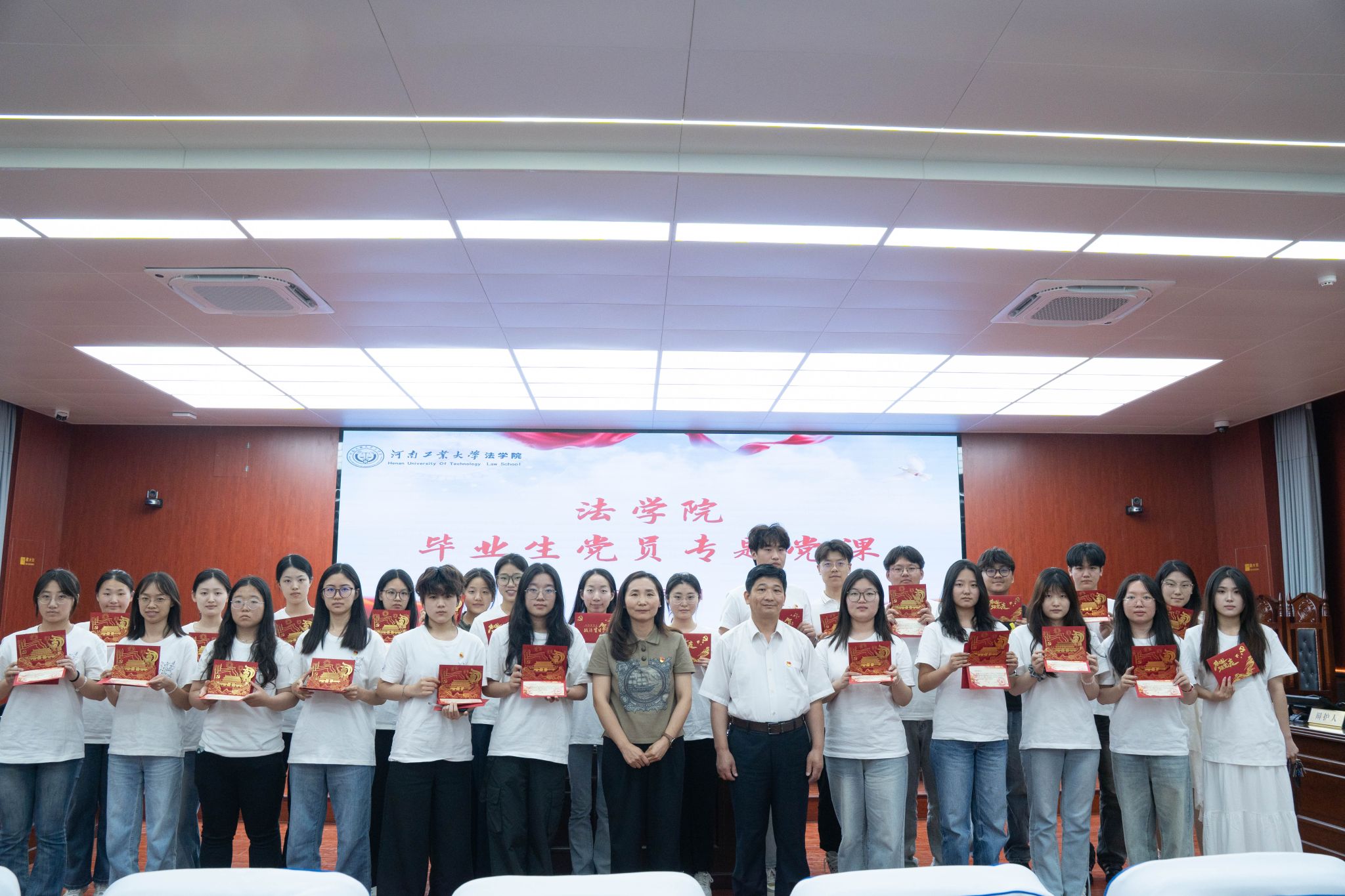 在智慧模拟法庭举行2025届毕业生党员专题教育活动。学院党委书记许文、党委副书记张翠华、学生党支部书记及全体毕业生党员参加活动。活动由学生第一党支部书记吉利主持。