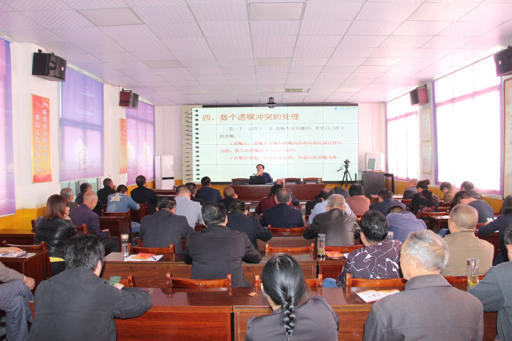 李耀跃介绍了我国民法典颁行的重要意义后,以《民法典中继承制度的新变化》为题,从继承权丧失事由的完善、法定继承人范围的扩大、遗嘱形式的增加、数个遗嘱冲突的处理等方面,分析了法律条文新变化中所体现的国家治理现代化导向,并结合农村工作实际解析了村干部作为见证人在遗嘱继承中需要注意的法律问题。