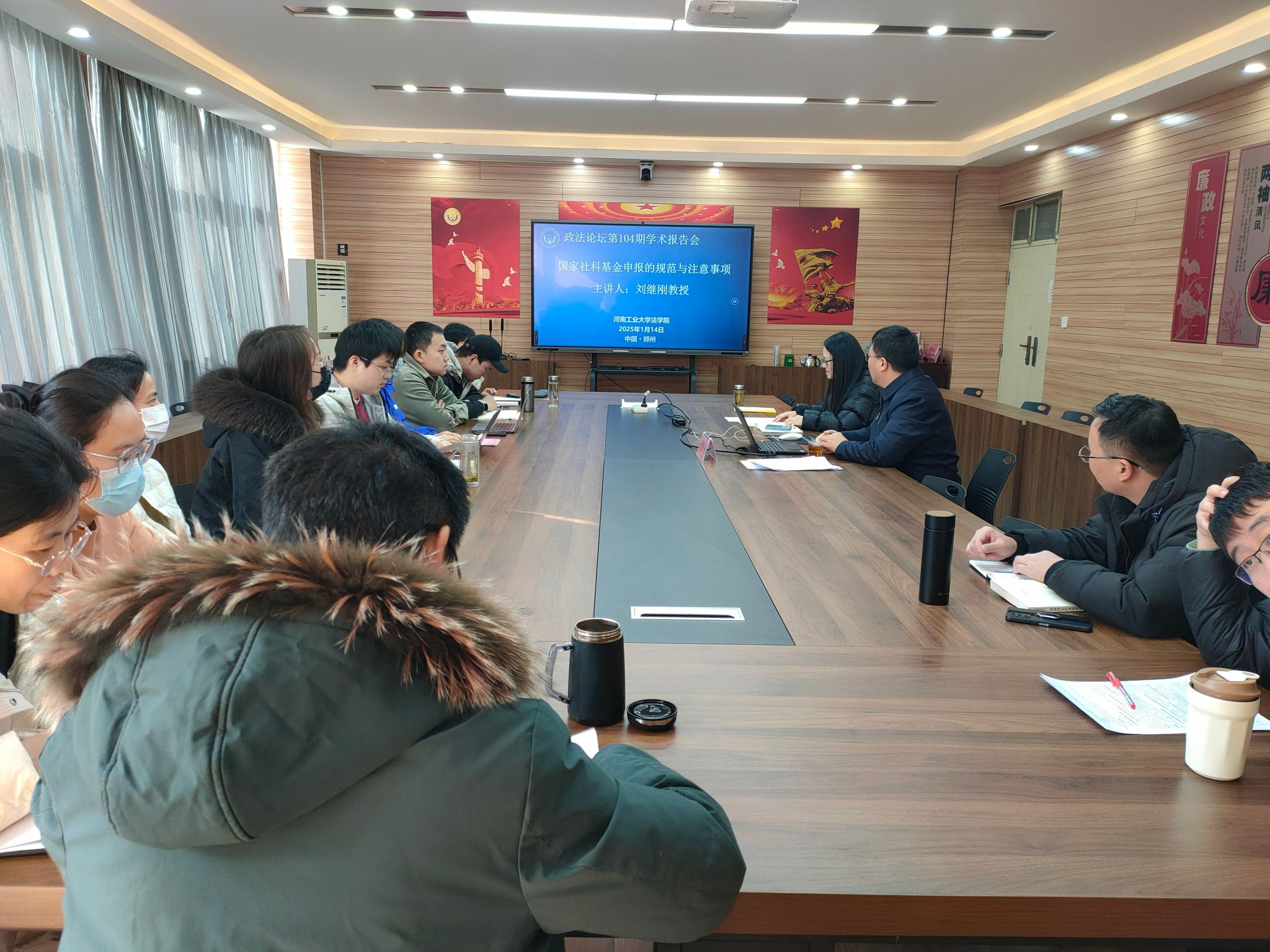 在3424会议室成功举办“政法论坛”第104期学术报告会。河南中医药大学管理学院院长刘继刚教授以“国家社科基金申报的规范与注意事项”为主题开展了一场精彩而丰富的学术报告。报告会由街射