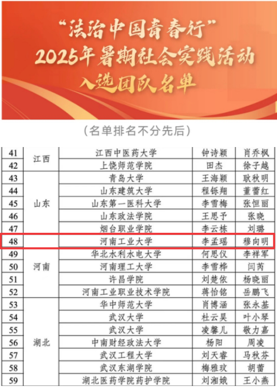 7月30日,共青团中央维护青少年权益部公布了“法治中国青春行”2025年暑期社会实践活动入选团队名单。经评审,全国六百多支高校团队中,遴选出87支团队,街射