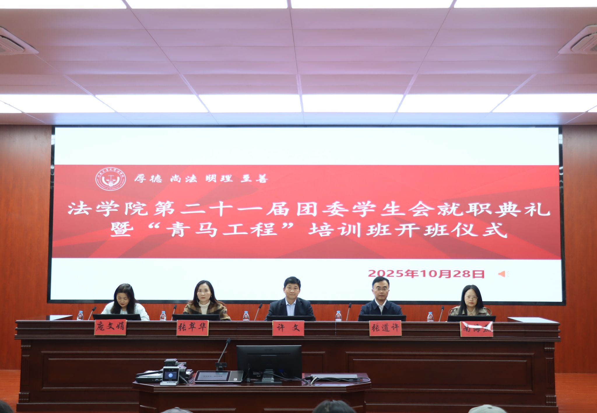 在智慧模拟法庭3121举行第二十一届学生工作人员就职典礼暨“青马工程”团学骨干培训班开班仪式。街射