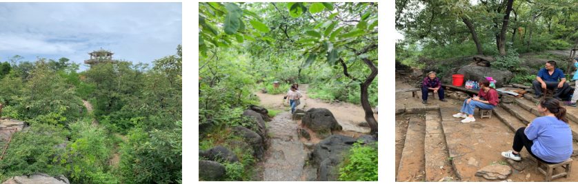 上午7点,负责线下任务的小组三人于荥阳市内汇合,随后乘车前往环翠峪景区。因为“听党指挥,能打胜仗”这句话深深地刻在我们每个国人的心中,所以我们决定先去探访八路军抗日指挥部遗址。八路军抗日指挥部遗址位于一座山峰的顶部,必须徒步行走,小组三人便从山底开始向上攀爬,经过一个多小时的时间终于爬到了山顶。这段本该令人疲惫不堪的山路,却使我们觉得充满力量,我们想这不仅是因为对先辈们的崇拜,也是因为这是一段英雄之路,这是一支英雄之师。