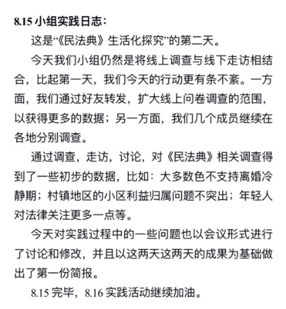 在全面推进依法治国的背景之下,《民法典》生活化是发展的必然趋势,虽然通过这两天的实践与调研,发现其现状并不乐观,但促进其发展,让法律之光照进生活,正是我们青年学子的,法学学子的奋进的动力与目标。