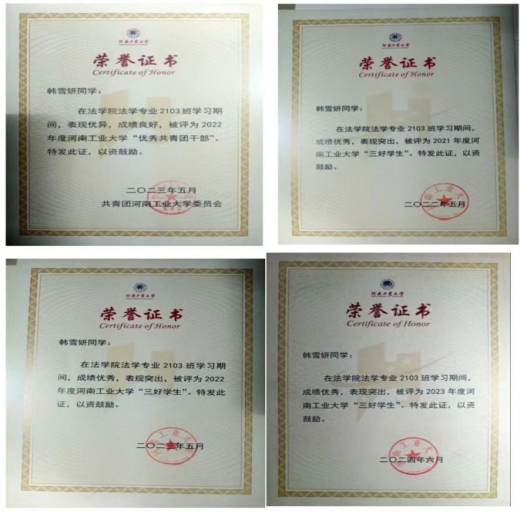 “学习之星”等荣誉称号,她积极参加社会实践并在多次志愿活动中获得“优秀志愿者”荣誉称号,顺利通过了法律职业资格考试、中小学教师资格考试(高中语文)。现已推免至西北政法大学民商街射